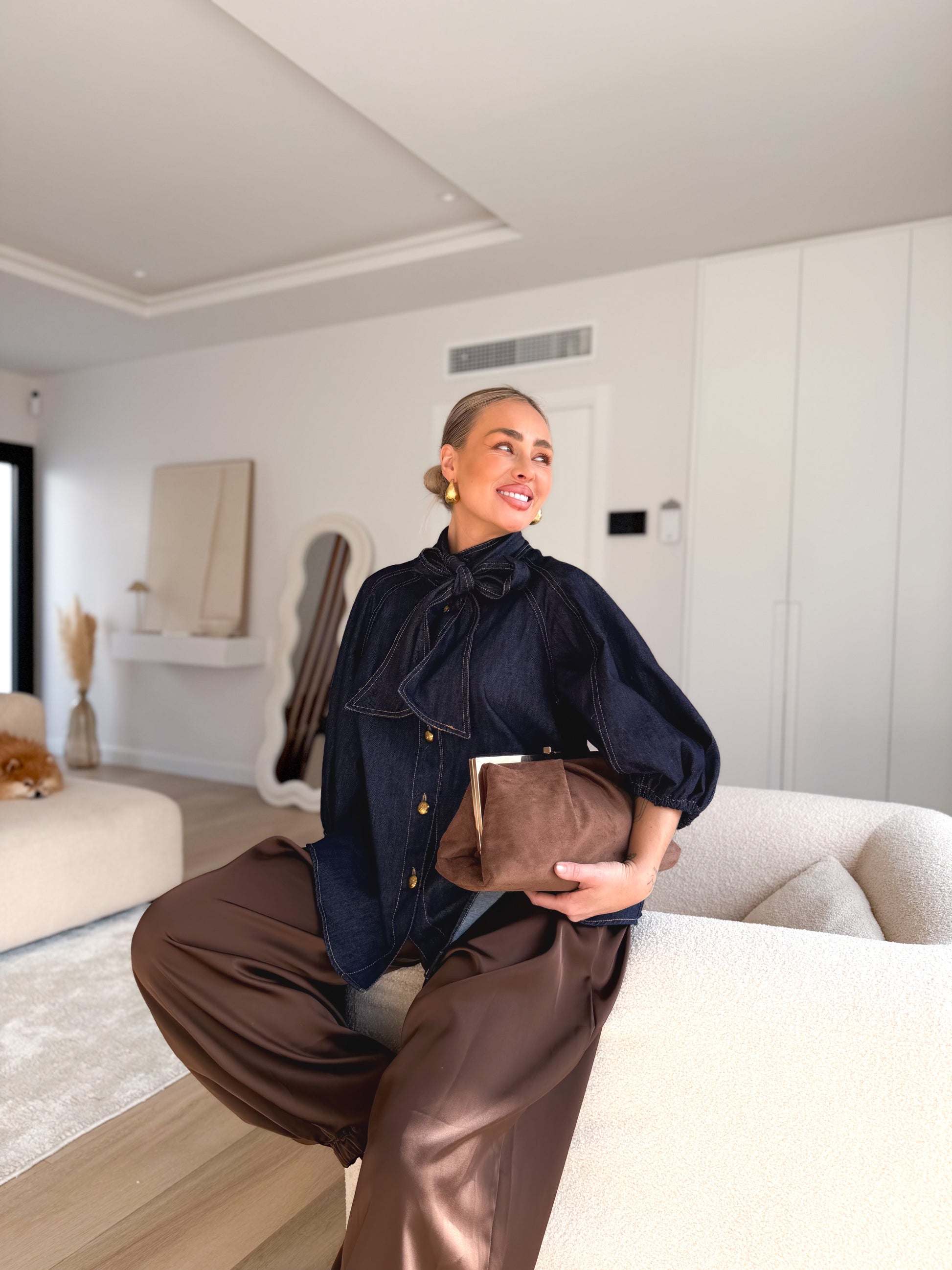 Camisa denim de estilo francés, mangas en globo al codo, detalle abotonado en joya dorado.