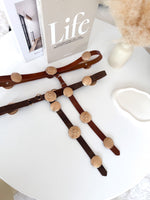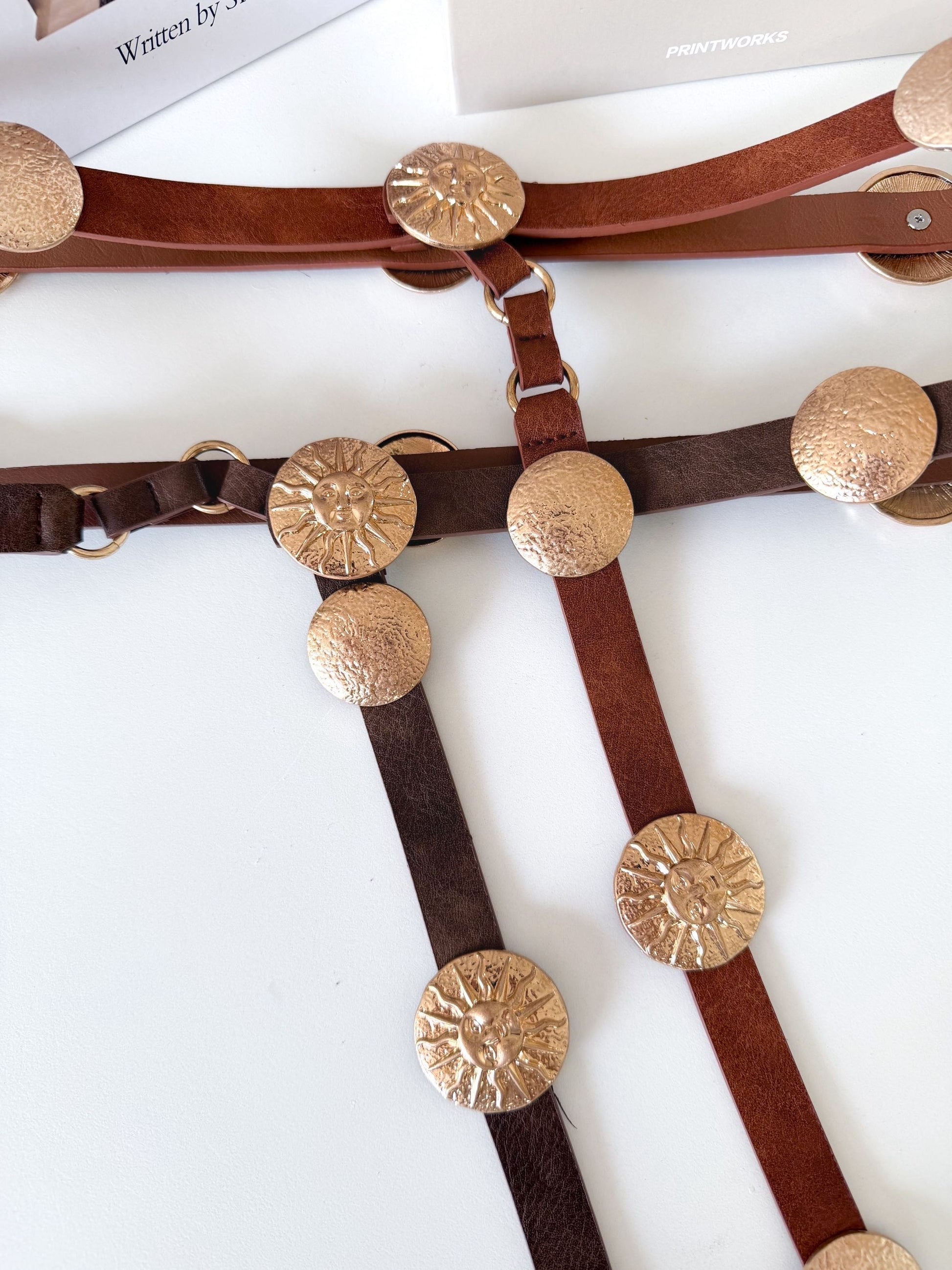 Cinturón fino combinado en polipiel y tachas doradas y con relieve en Sol.