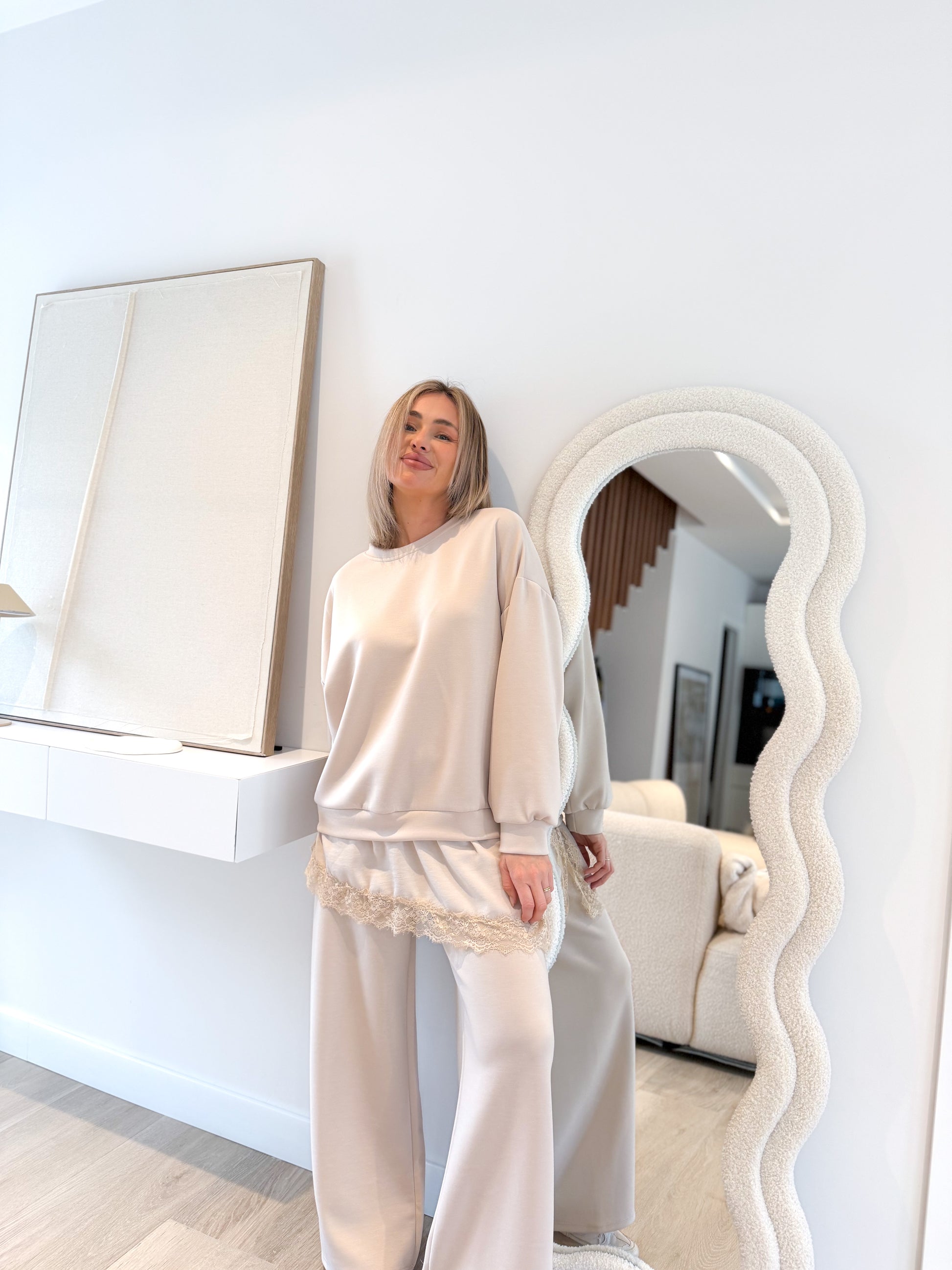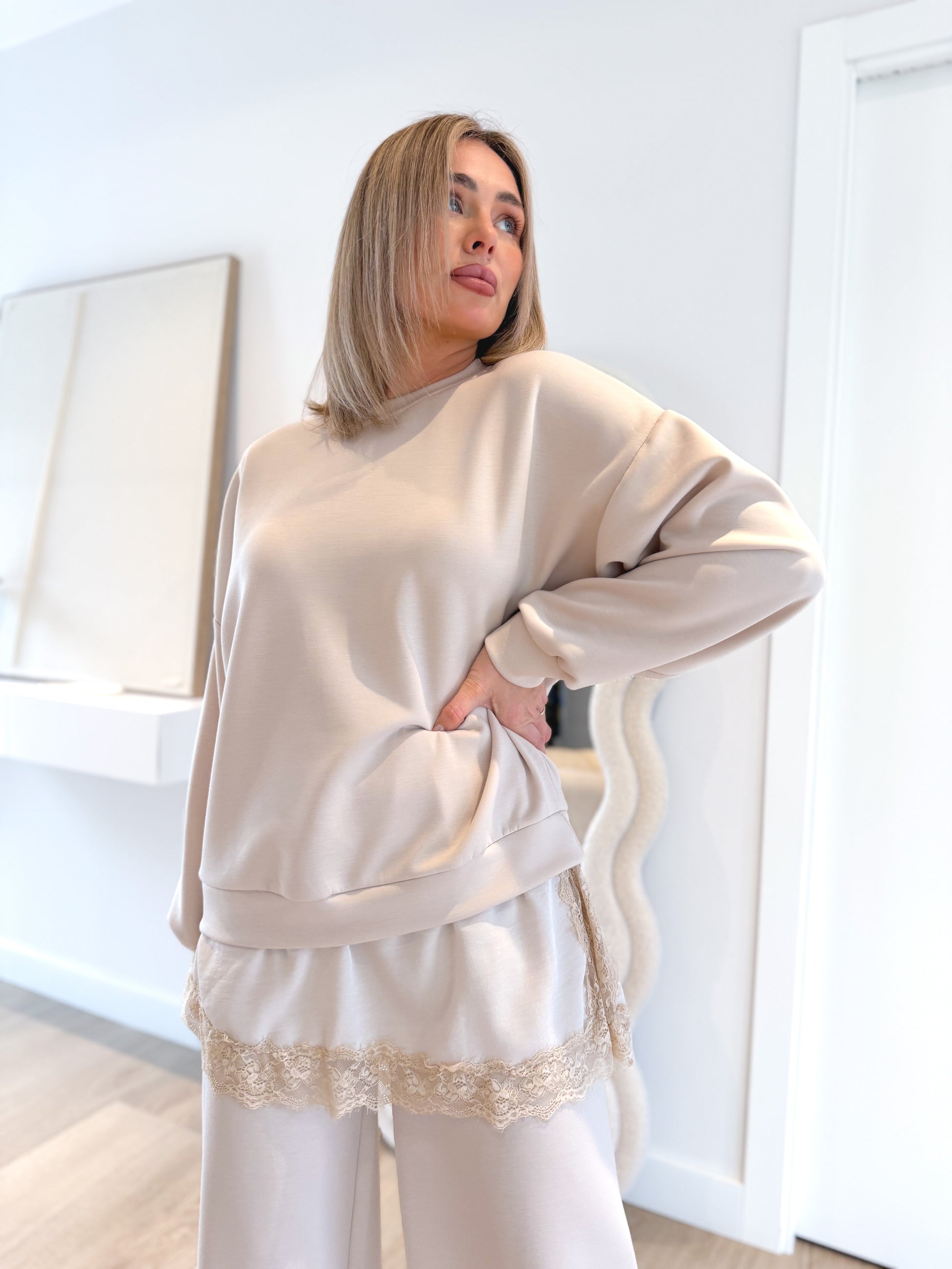 Conjunto combinado en sudadera oversize con lencero satinado incluido y pantalón en unitono amplio beige.