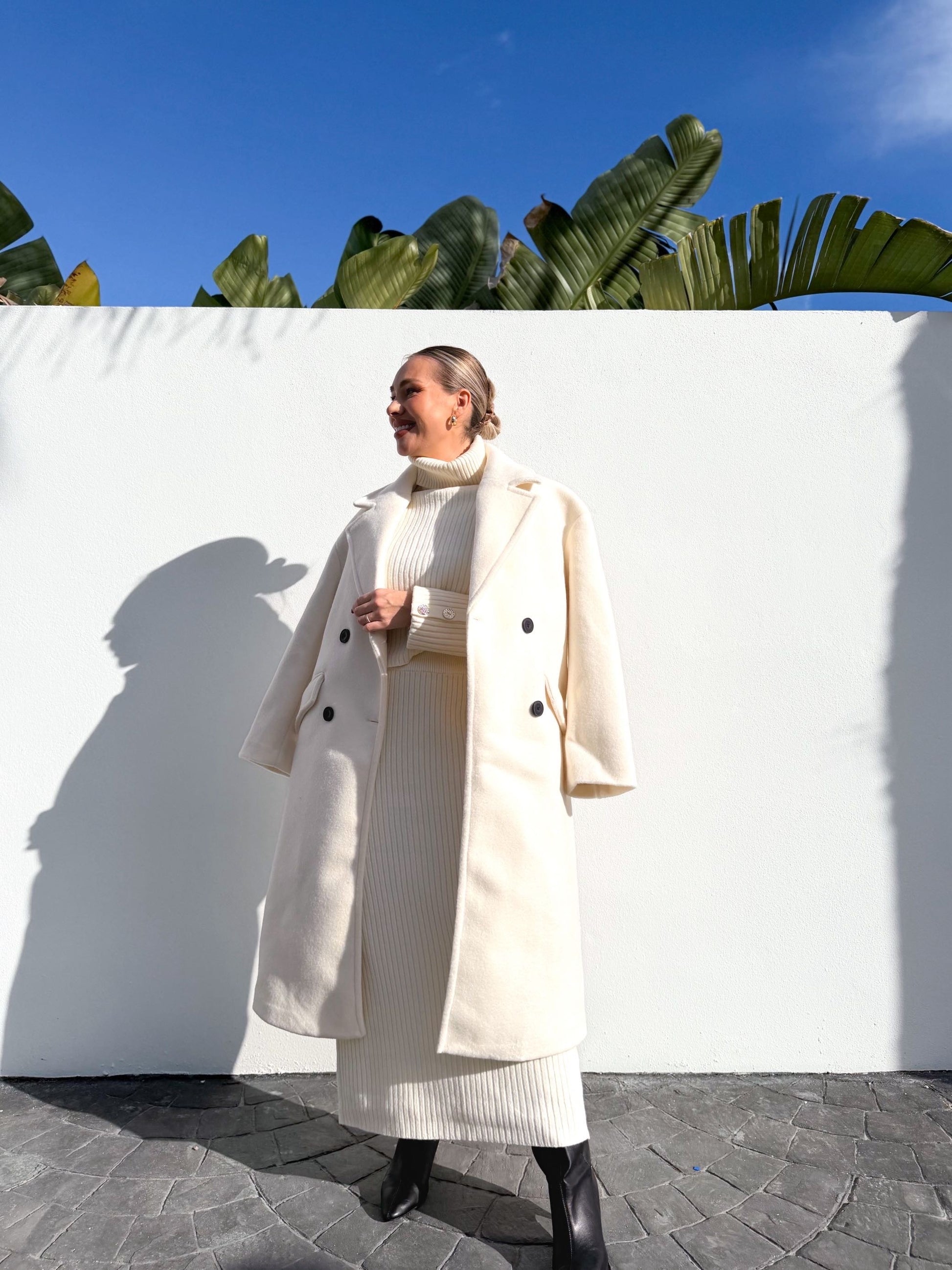 CConjunto de punto acanalado de cuello alto, detalles en puños abotonados.