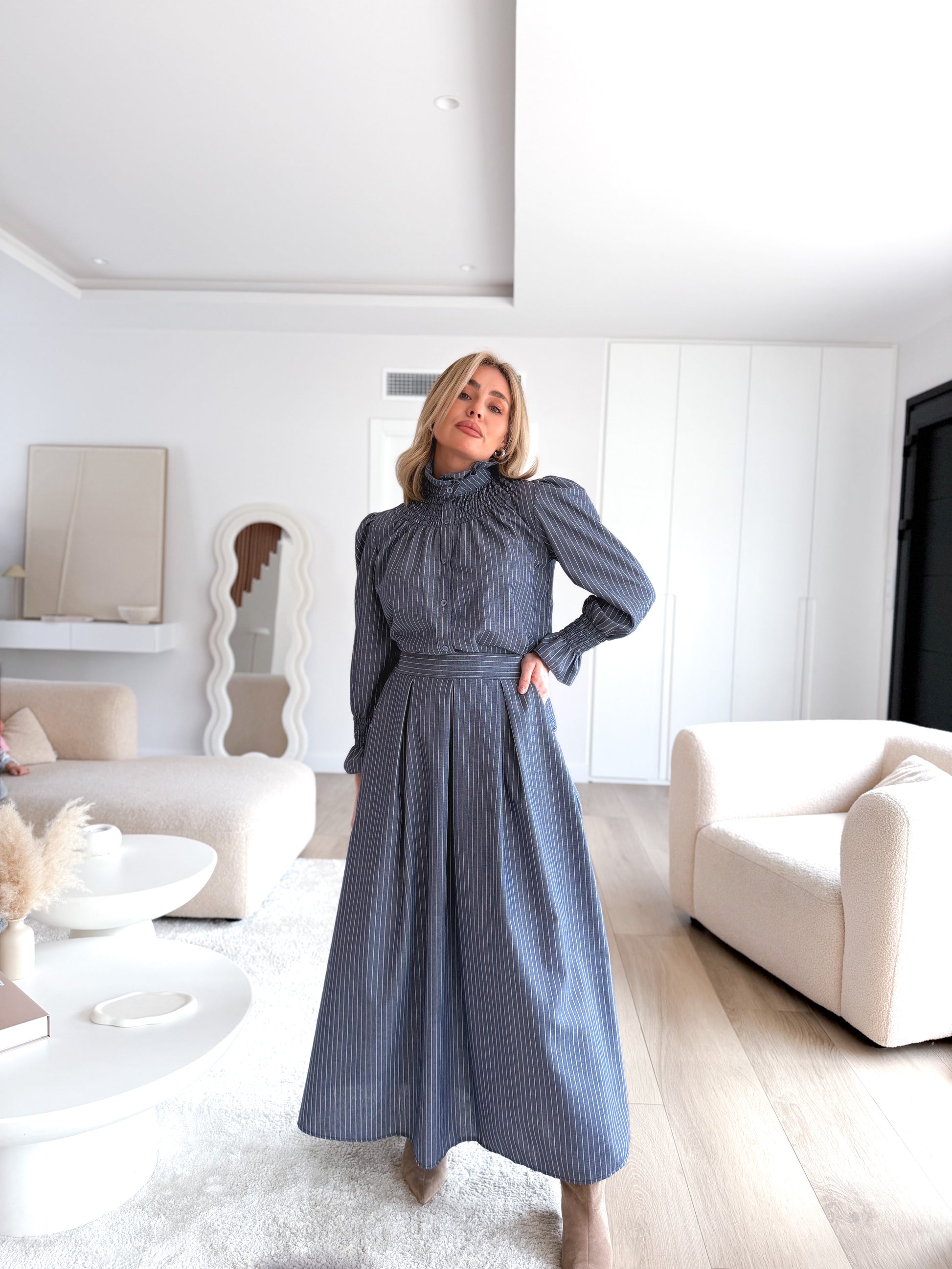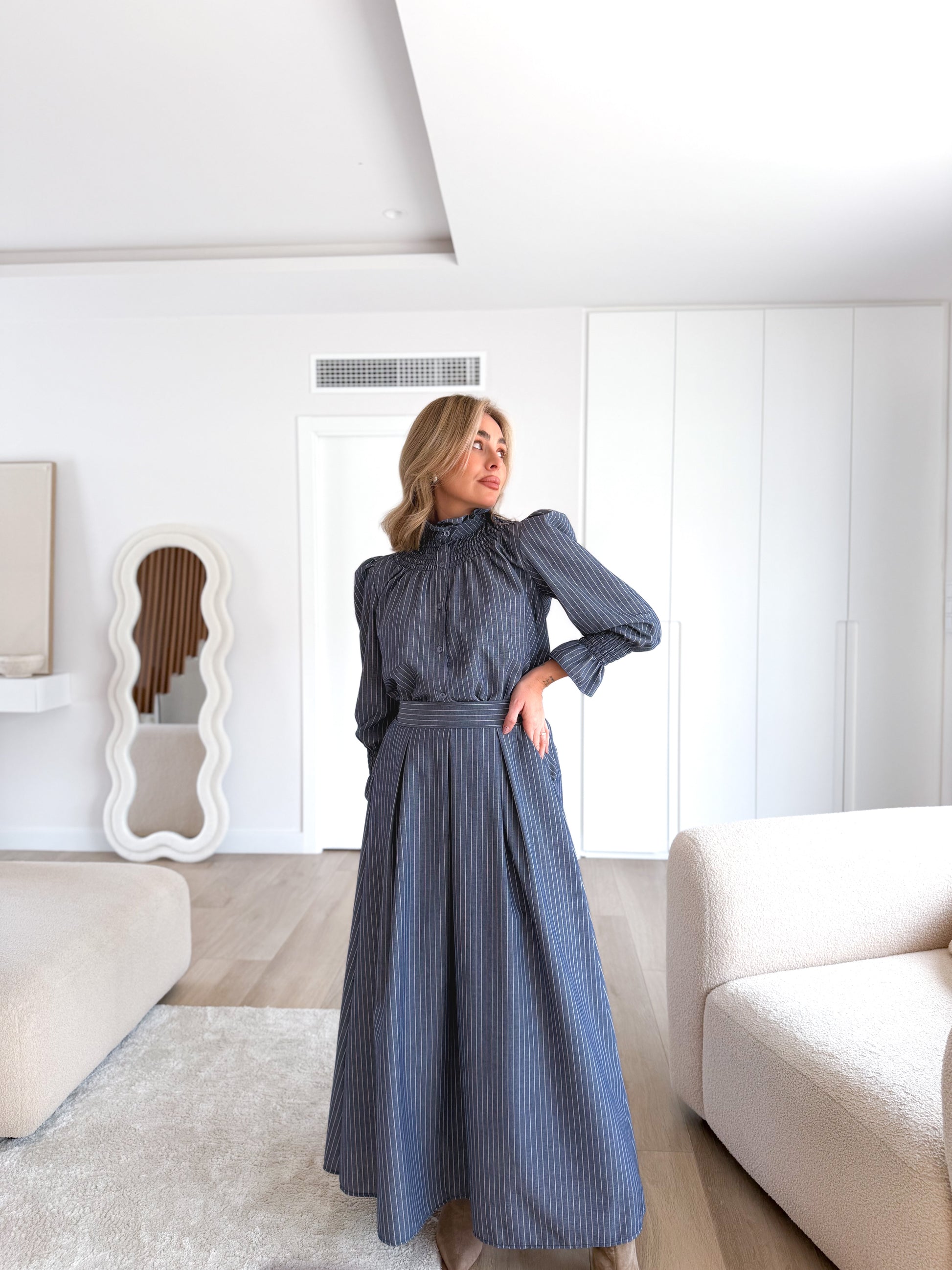 Falda larga en estampado de rayas , pinzas en el frontal detalle fruncido en cinturilla trasera y cremallera lateral.
