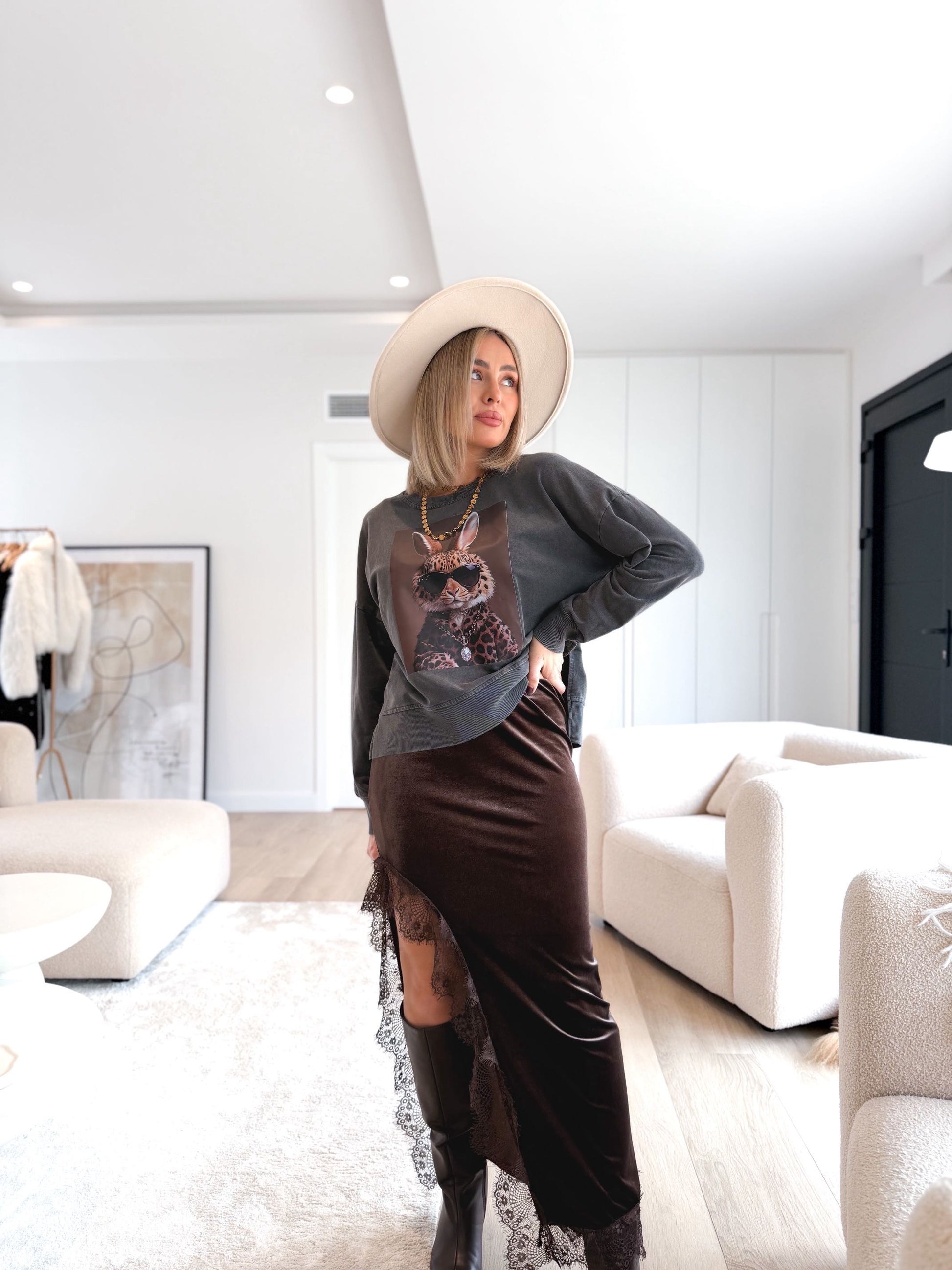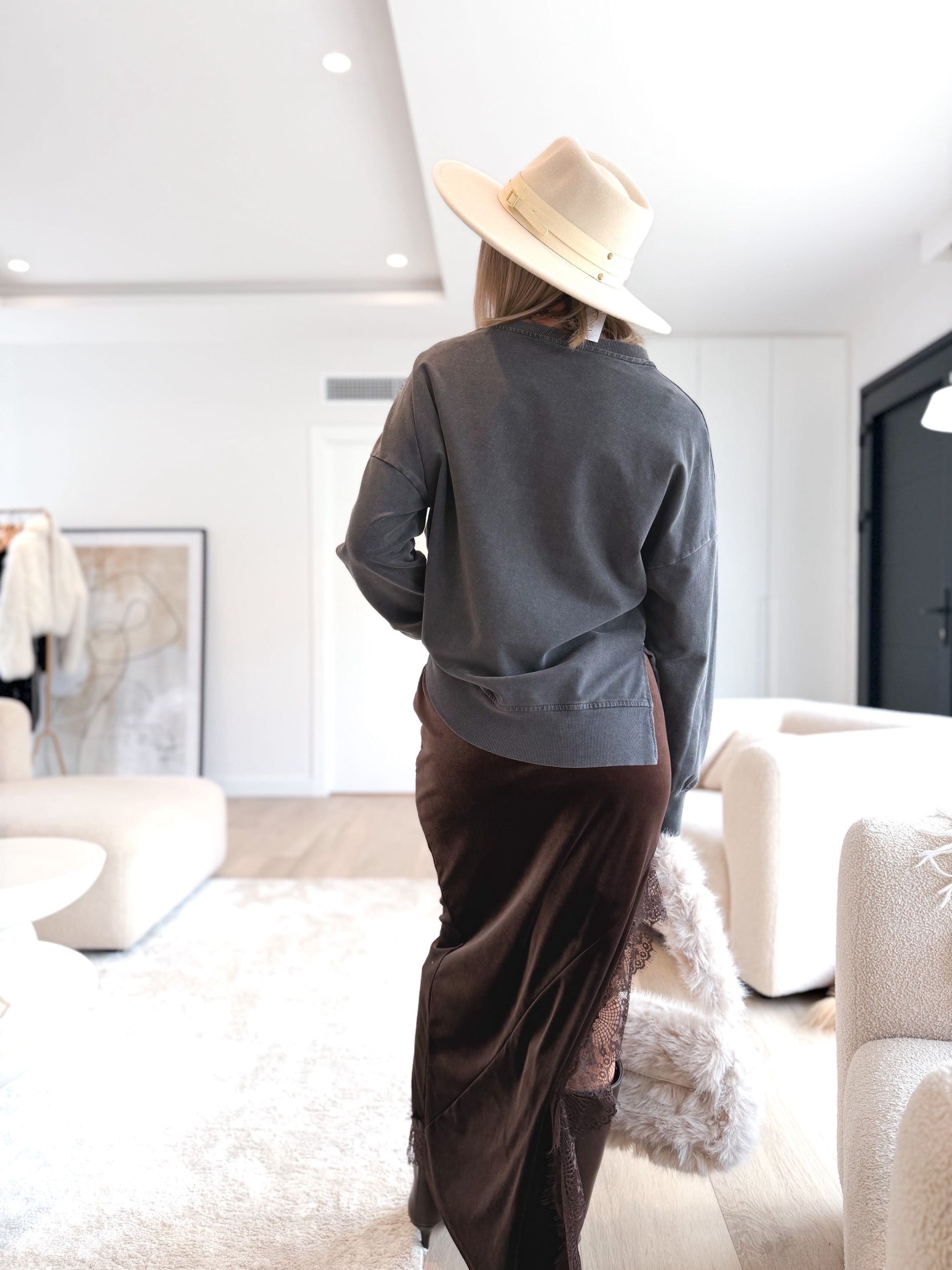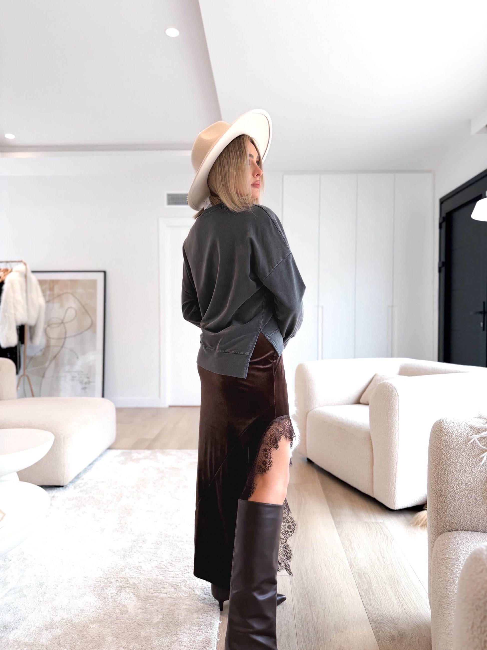 Falda de terciopelo largo , detalle en abertura lateral con encaje.