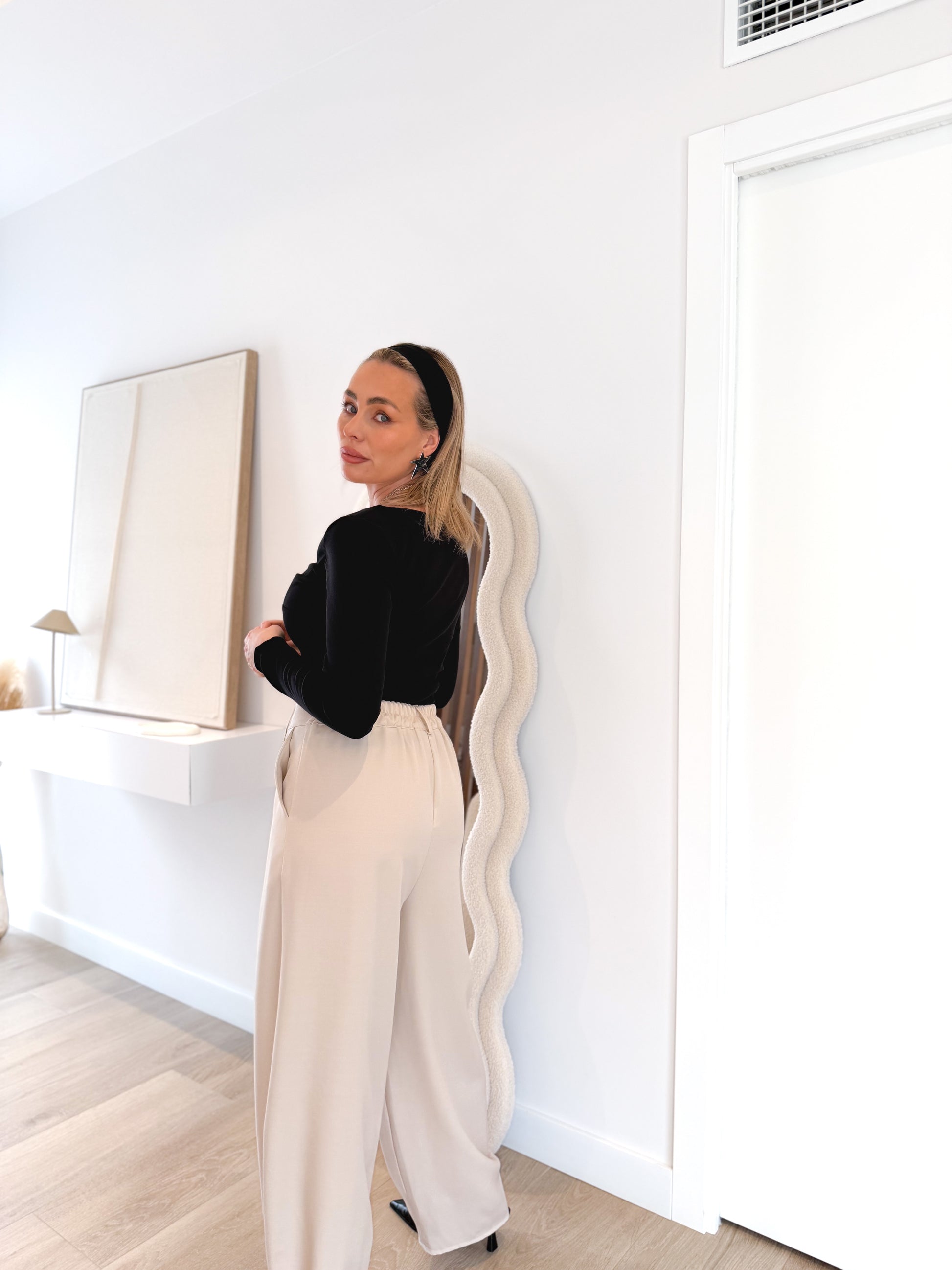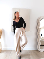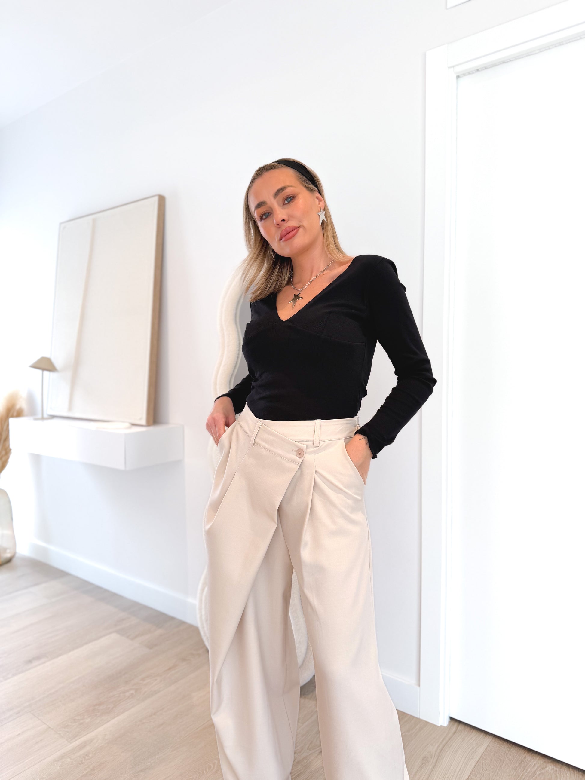 Pantalón de talle alto, cierre cruzado asimétrico, detalle en pinzas , cinturilla trasera fruncida.